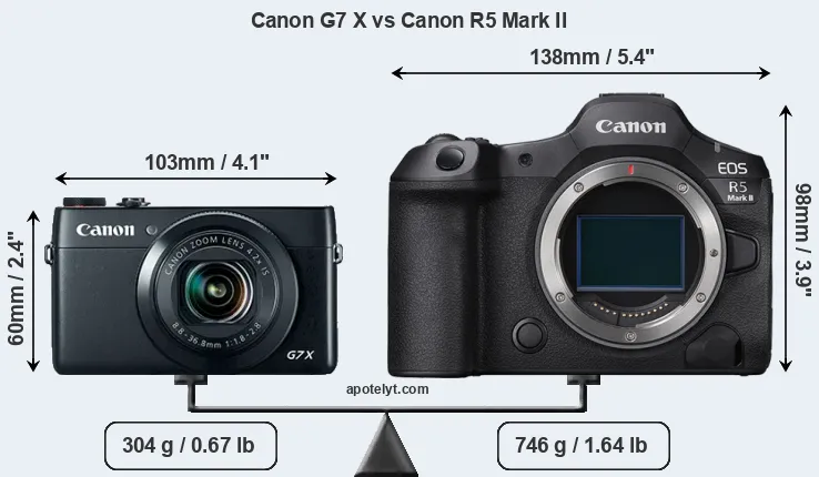 An illustration of the physical size and weight of the Canon G7 X and the Canon R5 Mark II is provided in the side-by-side display below. The two cameras are presented according to their relative size. Three consecutive views from the front, the top, and the rear side are shown. All width, height and depth dimensions are rounded to the nearest millimeter.