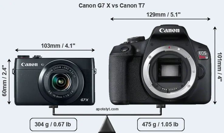 The physical size and weight of the Canon G7 X and the Canon T7 are illustrated in the side-by-side display below. The two cameras are presented according to their relative size. Three successive views from the front, the top, and the rear are shown. All width, height and depth measures are rounded to the nearest millimeter.