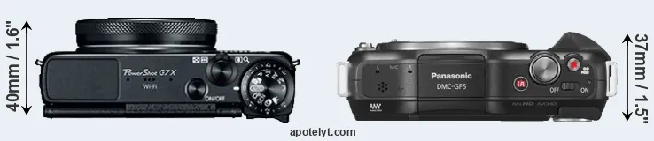 The side-by-side display below illustrates the physical size and weight of the Canon G7 X and the Panasonic GF5. The two cameras are presented according to their relative size. Three consecutive perspectives from the front, the top, and the back are available. All width, height and depth measures are rounded to the nearest millimeter.