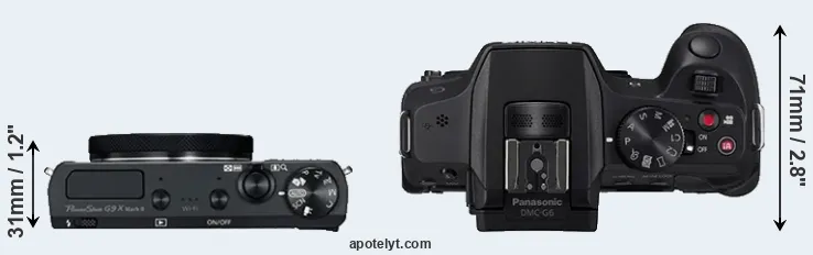 If the front view area (width x height) of the cameras is taken as an aggregate measure of their size, the Panasonic G6 is considerably larger (82 percent) than the Canon G9 X Mark II. In this context, it is worth noting that neither the G9X Mark II nor the G6 are weather-sealed.