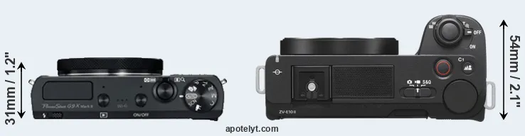 The above size and weight comparisons are to some extent incomplete and possibly misleading, as the G9X Mark II has a lens built in, whereas the ZV-E10 II is an interchangeable lens camera that requires a separate lens. Attaching the latter will add extra weight and bulk to the setup. You can compare the optics available for the ZV-E10 II and their specifications in the Sony E-Mount Lens Catalog.