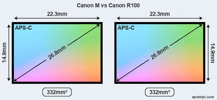 The Canon EOS M and the Canon EOS R100 are two digital cameras that were announced, respectively, in July 2012 and May 2023. Both the Canon M and the R100 are mirrorless interchangeable lens cameras that are equipped with an APS-C sensor. The Canon M has a resolution of 17.9 megapixels, whereas the R100 provides 24 MP.