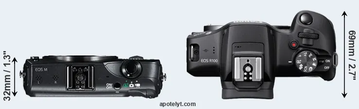 The physical size and weight of the Canon M and the Canon R100 are illustrated in the side-by-side display below. The two cameras are presented according to their relative size. Three successive views from the front, the top, and the rear are shown. All width, height and depth measures are rounded to the nearest millimeter.