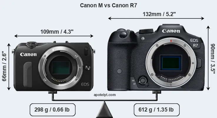 If the front view area (width x height) of the cameras is taken as an aggregate measure of their size, the Canon R7 is considerably larger (65 percent) than the Canon M. Moreover, the R7 is substantially heavier (105 percent) than the Canon M. It is noteworthy in this context that the R7 is splash and dust-proof, while the Canon M does not feature any corresponding weather-sealing.