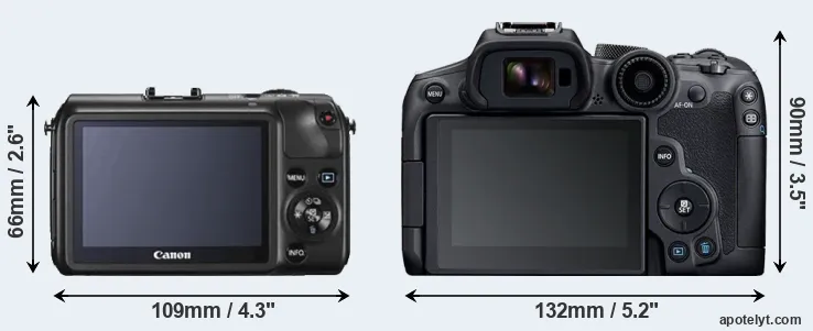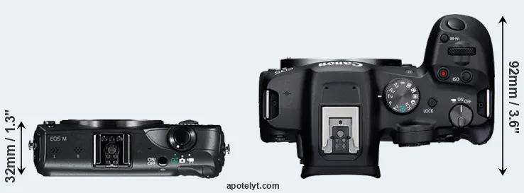 An illustration of the physical size and weight of the Canon M and the Canon R7 is provided in the side-by-side display below. The two cameras are presented according to their relative size. Three successive views from the front, the top, and the rear are shown. All width, height and depth measures are rounded to the nearest millimeter.