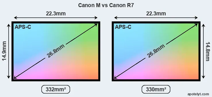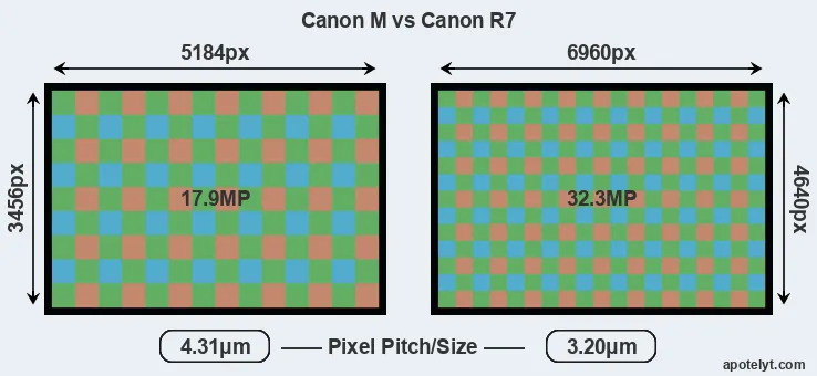Despite having a slightly smaller sensor, the R7 offers a higher resolution of 32.3 megapixels, compared with 17.9 MP of the Canon M. This megapixels advantage comes at the cost of a higher pixel density and a smaller size of the individual pixel (with a pixel pitch of 3.20μm versus 4.31μm for the Canon M). However, it should be noted that the R7 is much more recent (by 9 years and 10 months) than the Canon M, and its sensor will have benefitted from technological advances during this time that make it possible to gather light more efficiently.