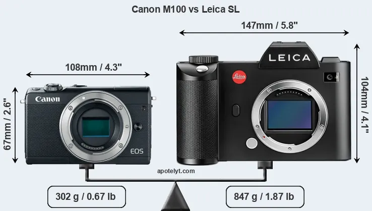 If the front view area (width x height) of the cameras is taken as an aggregate measure of their size, the Leica SL is considerably larger (111 percent) than the Canon M100. Moreover, the Leica SL is substantially heavier (180 percent) than the M100. It is noteworthy in this context that the Leica SL is splash and dust-proof, while the M100 does not feature any corresponding weather-sealing.