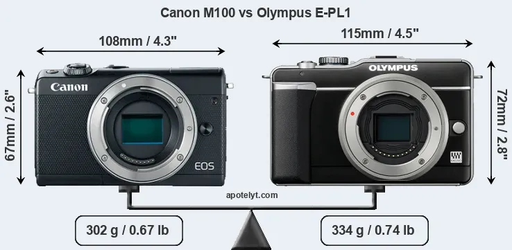 The physical size and weight of the Canon M100 and the Olympus E-PL1 are illustrated in the side-by-side display below. The two cameras are presented according to their relative size. Three successive views from the front, the top, and the rear are shown. All width, height and depth measures are rounded to the nearest millimeter.