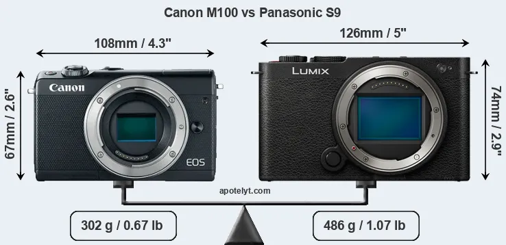 An illustration of the physical size and weight of the Canon M100 and the Panasonic S9 is provided in the side-by-side display below. The two cameras are presented according to their relative size. Three successive views from the front, the top, and the rear are shown. All width, height and depth dimensions are rounded to the nearest millimeter.