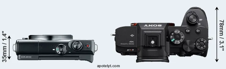 The side-by-side display below illustrates the physical size and weight of the Canon M100 and the Sony A7R IVA. The two cameras are presented according to their relative size. Three consecutive views from the front, the top, and the rear side are shown. All width, height and depth dimensions are rounded to the nearest millimeter.