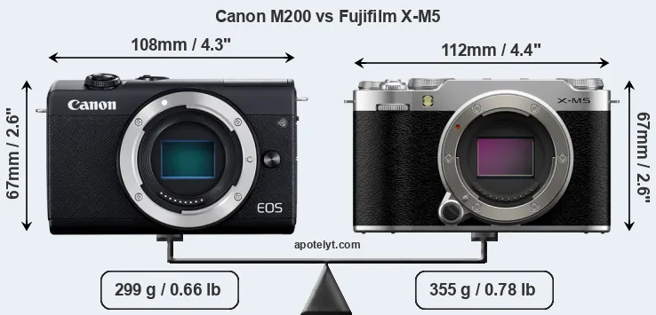 The physical size and weight of the Canon M200 and the Fujifilm X-M5 are illustrated in the side-by-side display below. The two cameras are presented according to their relative size. Three consecutive perspectives from the front, the top, and the back are available. All width, height and depth dimensions are rounded to the nearest millimeter.