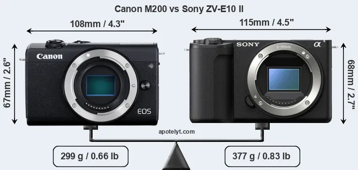 If the front view area (width x height) of the cameras is taken as an aggregate measure of their size, the Sony ZV-E10 II is notably larger (8 percent) than the Canon M200. Moreover, the ZV-E10 II is markedly heavier (26 percent) than the M200. In this context, it is worth noting that neither the M200 nor the ZV-E10 II are weather-sealed.