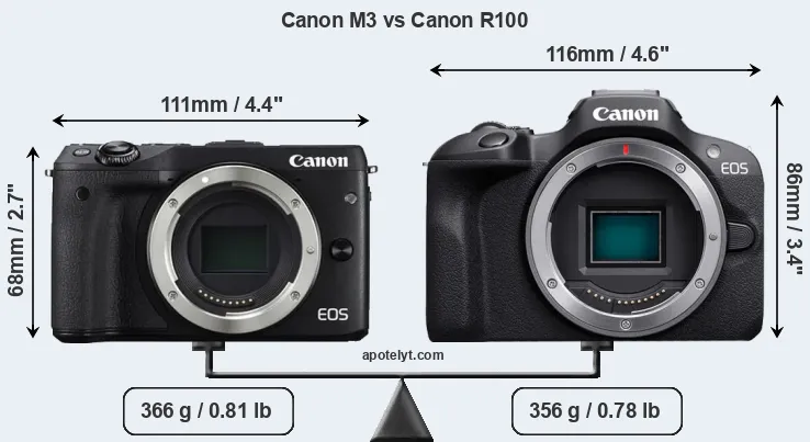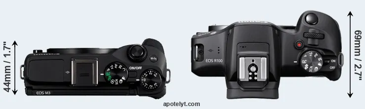 The side-by-side display below illustrates the physical size and weight of the Canon M3 and the Canon R100. The two cameras are presented according to their relative size. Three consecutive perspectives from the front, the top, and the back are available. All size dimensions are rounded to the nearest millimeter.
