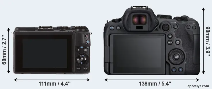 If the front view area (width x height) of the cameras is taken as an aggregate measure of their size, the Canon R6 Mark II is considerably larger (79 percent) than the Canon M3. Moreover, the R6 Mark II is substantially heavier (83 percent) than the M3. It is noteworthy in this context that the R6 Mark II is splash and dust-proof, while the M3 does not feature any corresponding weather-sealing.