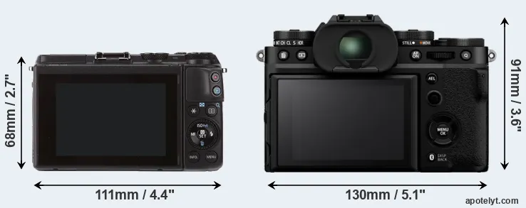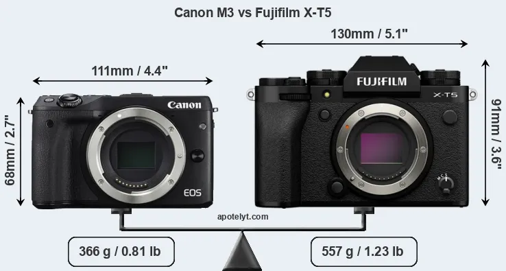The physical size and weight of the Canon M3 and the Fujifilm X-T5 are illustrated in the side-by-side display below. The two cameras are presented according to their relative size. Three successive views from the front, the top, and the rear are shown. All size dimensions are rounded to the nearest millimeter.