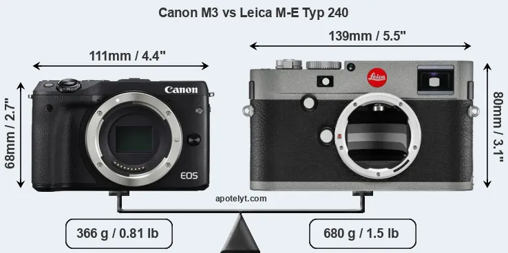 If the front view area (width x height) of the cameras is taken as an aggregate measure of their size, the Leica M-E Typ 240 is considerably larger (47 percent) than the Canon M3. Moreover, the M-E Typ 240 is substantially heavier (86 percent) than the M3. It is noteworthy in this context that the M-E Typ 240 is splash and dust-proof, while the M3 does not feature any corresponding weather-sealing.