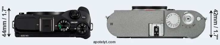 The physical size and weight of the Canon M3 and the Leica M-E Typ 240 are illustrated in the side-by-side display below. The two cameras are presented according to their relative size. Three consecutive views from the front, the top, and the rear side are shown. All size dimensions are rounded to the nearest millimeter.