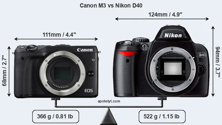 The side-by-side display below illustrates the physical size and weight of the Canon M3 and the Nikon D40. The two cameras are presented according to their relative size. Three consecutive perspectives from the front, the top, and the back are available. All width, height and depth measures are rounded to the nearest millimeter.