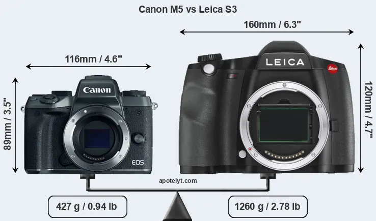 If the front view area (width x height) of the cameras is taken as an aggregate measure of their size, the Leica S3 is considerably larger (86 percent) than the Canon M5. Moreover, the S3 is substantially heavier (195 percent) than the M5. It is noteworthy in this context that the S3 is splash and dust-proof, while the M5 does not feature any corresponding weather-sealing.