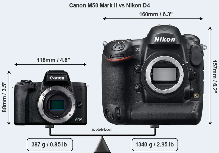 An illustration of the physical size and weight of the Canon M50 Mark II and the Nikon D4 is provided in the side-by-side display below. The two cameras are presented according to their relative size. Three consecutive perspectives from the front, the top, and the back are available. All size dimensions are rounded to the nearest millimeter.