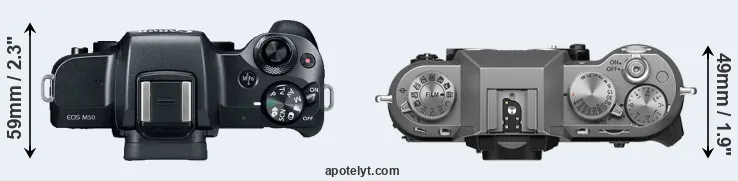 The side-by-side display below illustrates the physical size and weight of the Canon M50 and the Fujifilm X-T50. The two cameras are presented according to their relative size. Three consecutive perspectives from the front, the top, and the back are available. All size dimensions are rounded to the nearest millimeter.