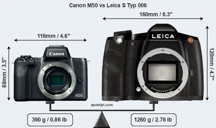 The side-by-side display below illustrates the physical size and weight of the Canon M50 and the Leica S Typ 006. The two cameras are presented according to their relative size. Three successive views from the front, the top, and the rear are shown. All width, height and depth dimensions are rounded to the nearest millimeter.