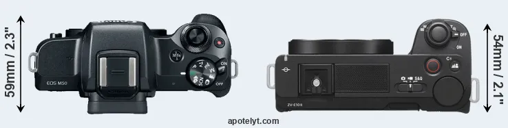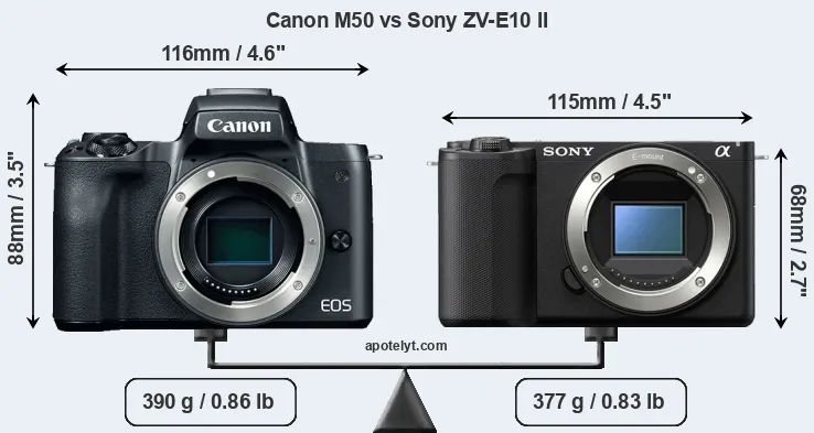 The physical size and weight of the Canon M50 and the Sony ZV-E10 II are illustrated in the side-by-side display below. The two cameras are presented according to their relative size. Three consecutive views from the front, the top, and the rear side are shown. All width, height and depth measures are rounded to the nearest millimeter.