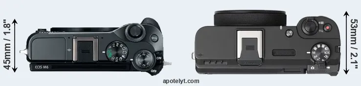 The side-by-side display below illustrates the physical size and weight of the Canon M6 and the Canon V1. The two cameras are presented according to their relative size. Three successive views from the front, the top, and the rear are shown. All width, height and depth dimensions are rounded to the nearest millimeter.