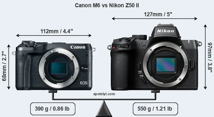 If the front view area (width x height) of the cameras is taken as an aggregate measure of their size, the Nikon Z50 II is considerably larger (62 percent) than the Canon M6. Moreover, the Z50 II is substantially heavier (41 percent) than the M6. It is noteworthy in this context that the Z50 II is splash and dust-proof, while the M6 does not feature any corresponding weather-sealing.