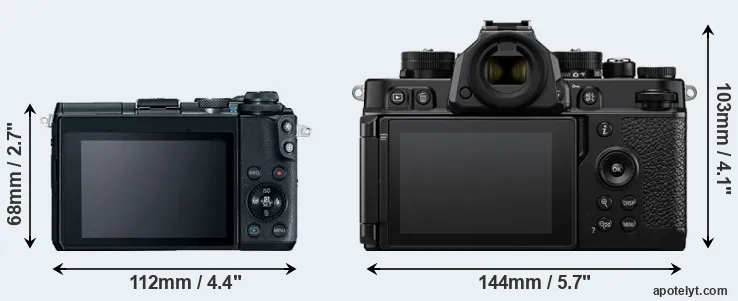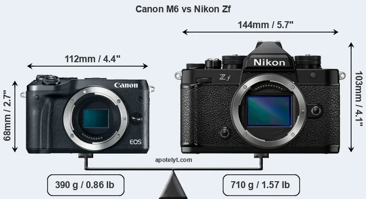 If the front view area (width x height) of the cameras is taken as an aggregate measure of their size, the Nikon Zf is considerably larger (95 percent) than the Canon M6. Moreover, the Zf is substantially heavier (82 percent) than the M6. It is noteworthy in this context that the Zf is splash and dust-proof, while the M6 does not feature any corresponding weather-sealing.