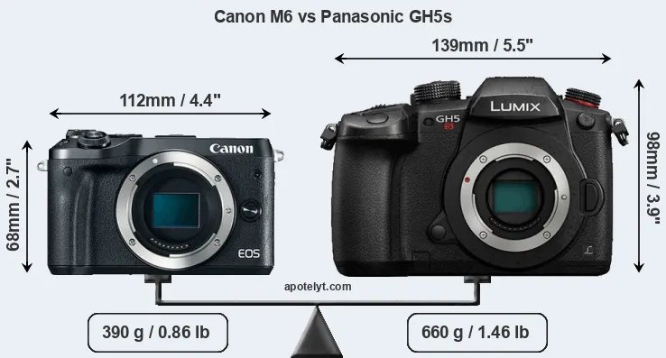 If the front view area (width x height) of the cameras is taken as an aggregate measure of their size, the Panasonic GH5s is considerably larger (79 percent) than the Canon M6. Moreover, the GH5s is substantially heavier (69 percent) than the M6. It is noteworthy in this context that the GH5s is splash and dust-proof, while the M6 does not feature any corresponding weather-sealing.