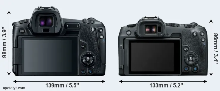 Both cameras under consideration feature a full frame sensor, but their sensors differ slightly in size. The sensor area in the R8 is 1 percent smaller. They nevertheless have the same format factor of 1.0. Both cameras have a native aspect ratio (sensor width to sensor height) of 3:2.