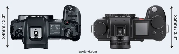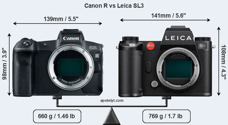 An illustration of the physical size and weight of the Canon R and the Leica SL3 is provided in the side-by-side display below. The two cameras are presented according to their relative size. Three consecutive perspectives from the front, the top, and the back are available. All width, height and depth dimensions are rounded to the nearest millimeter.