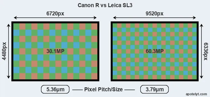 While the two cameras under review share the same sensor size, the Leica SL3 offers a higher resolution of 60.3 megapixels, compared with 30.1 MP of the Canon R. This megapixels advantage translates into a 42 percent gain in linear resolution. On the other hand, these sensor specs imply that the Leica SL3 has a higher pixel density and a smaller size of the individual pixel (with a pixel pitch of 3.79μm versus 5.36μm for the Canon R). However, it should be noted that the Leica SL3 is much more recent (by 5 years and 6 months) than the Canon R, and its sensor will have benefitted from technological advances during this time that compensate for the smaller pixel size. Coming back to sensor resolution, it should be mentioned that the Leica SL3 has no anti-alias filter installed, so that it can capture all the detail its sensor resolves.