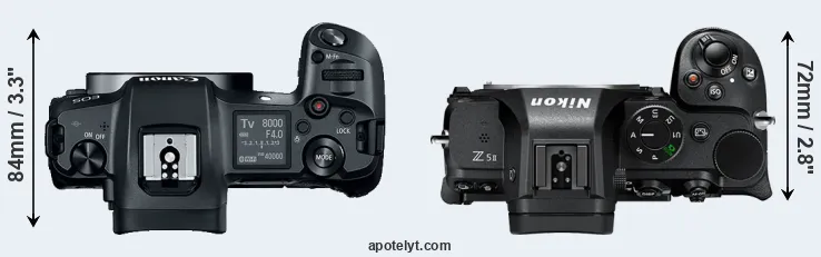 The side-by-side display below illustrates the physical size and weight of the Canon R and the Nikon Z5 II. The two cameras are presented according to their relative size. Three consecutive perspectives from the front, the top, and the back are available. All width, height and depth measures are rounded to the nearest millimeter.