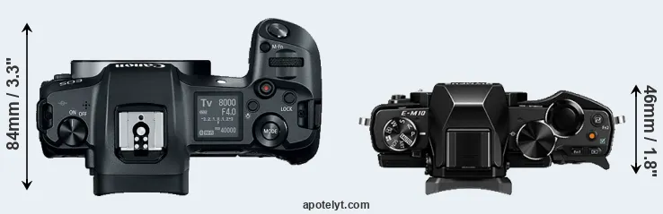 An illustration of the physical size and weight of the Canon R and the Olympus E-M10 is provided in the side-by-side display below. The two cameras are presented according to their relative size. Three consecutive perspectives from the front, the top, and the back are available. All width, height and depth dimensions are rounded to the nearest millimeter.