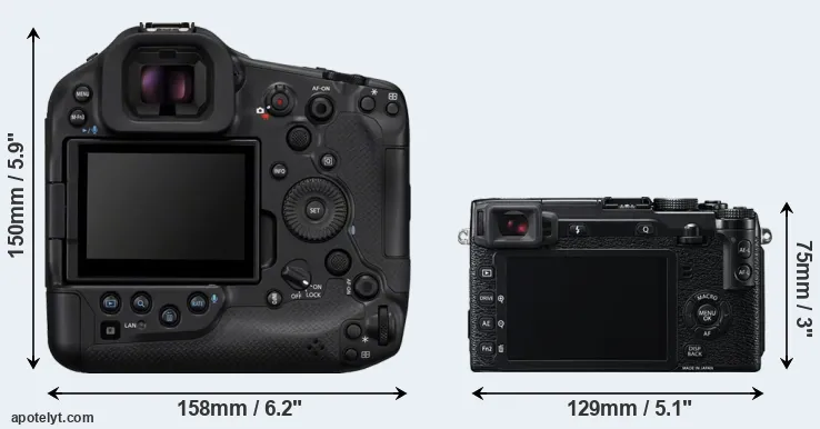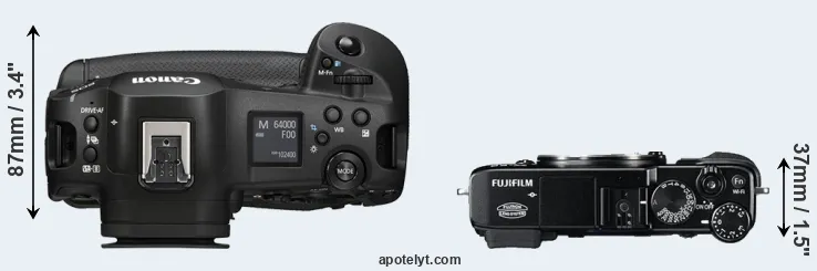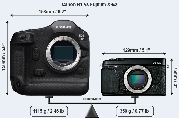 The side-by-side display below illustrates the physical size and weight of the Canon R1 and the Fujifilm X-E2. The two cameras are presented according to their relative size. Three consecutive perspectives from the front, the top, and the back are available. All width, height and depth measures are rounded to the nearest millimeter.