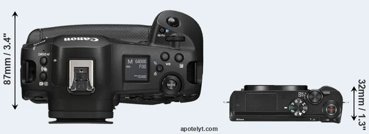 An illustration of the physical size and weight of the Canon R1 and the Nikon 1 J5 is provided in the side-by-side display below. The two cameras are presented according to their relative size. Three consecutive views from the front, the top, and the rear side are shown. All width, height and depth measures are rounded to the nearest millimeter.