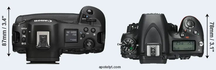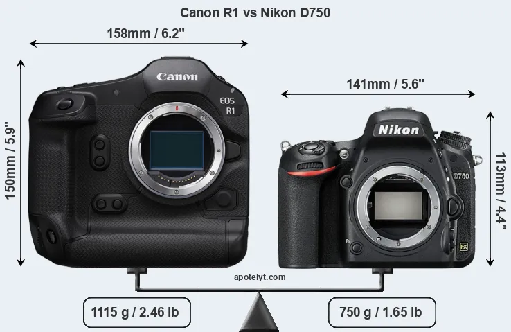 The physical size and weight of the Canon R1 and the Nikon D750 are illustrated in the side-by-side display below. The two cameras are presented according to their relative size. Three consecutive perspectives from the front, the top, and the back are available. All width, height and depth measures are rounded to the nearest millimeter.