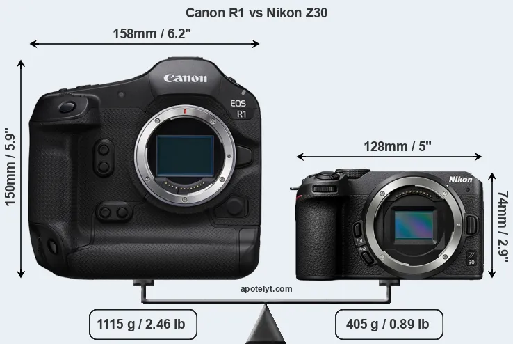 An illustration of the physical size and weight of the Canon R1 and the Nikon Z30 is provided in the side-by-side display below. The two cameras are presented according to their relative size. Three successive views from the front, the top, and the rear are shown. All width, height and depth dimensions are rounded to the nearest millimeter.