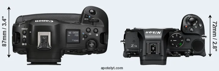 An illustration of the physical size and weight of the Canon R1 and the Nikon Z5 II is provided in the side-by-side display below. The two cameras are presented according to their relative size. Three consecutive views from the front, the top, and the rear side are shown. All width, height and depth measures are rounded to the nearest millimeter.