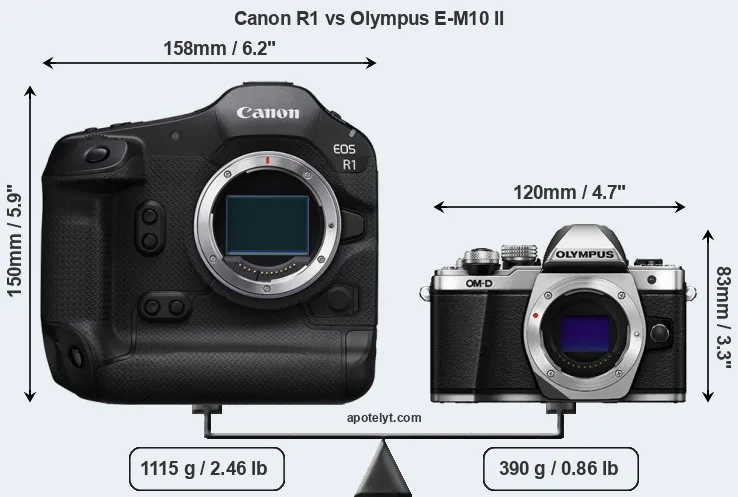 An illustration of the physical size and weight of the Canon R1 and the Olympus E-M10 II is provided in the side-by-side display below. The two cameras are presented according to their relative size. Three consecutive perspectives from the front, the top, and the back are available. All width, height and depth measures are rounded to the nearest millimeter.
