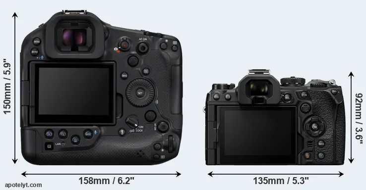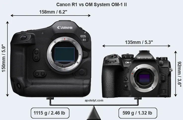 The side-by-side display below illustrates the physical size and weight of the Canon R1 and the OM System OM-1 II. The two cameras are presented according to their relative size. Three successive views from the front, the top, and the rear are shown. All width, height and depth dimensions are rounded to the nearest millimeter.