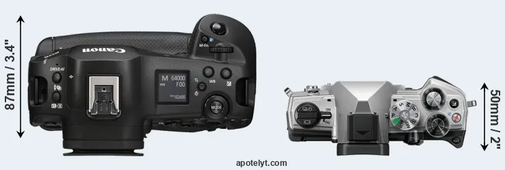 The physical size and weight of the Canon R1 and the OM System OM-5 are illustrated in the side-by-side display below. The two cameras are presented according to their relative size. Three consecutive perspectives from the front, the top, and the back are available. All width, height and depth measures are rounded to the nearest millimeter.