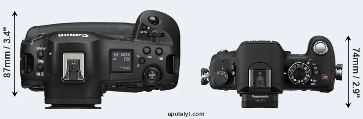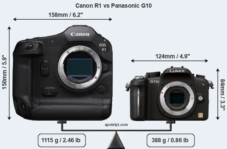 The physical size and weight of the Canon R1 and the Panasonic G10 are illustrated in the side-by-side display below. The two cameras are presented according to their relative size. Three consecutive perspectives from the front, the top, and the back are available. All size dimensions are rounded to the nearest millimeter.