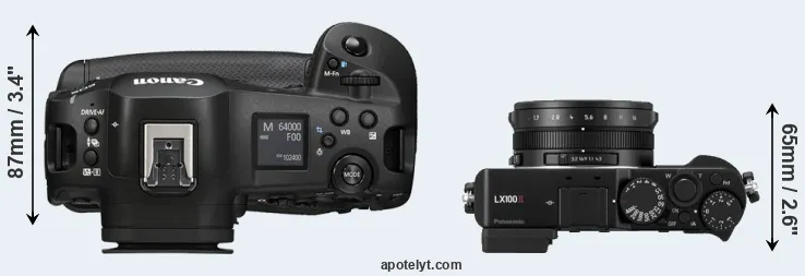 An illustration of the physical size and weight of the Canon R1 and the Panasonic LX100 II is provided in the side-by-side display below. The two cameras are presented according to their relative size. Three successive views from the front, the top, and the rear are shown. All size dimensions are rounded to the nearest millimeter.