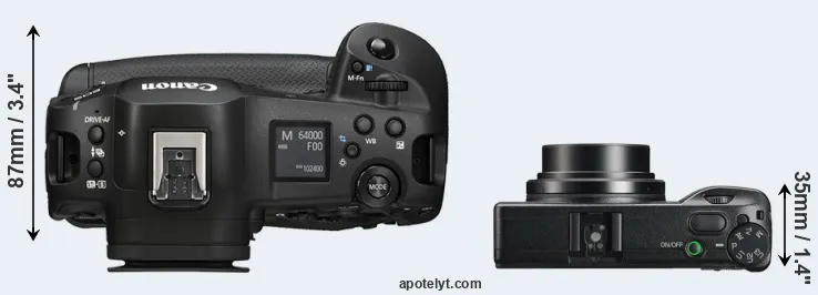 An illustration of the physical size and weight of the Canon R1 and the Ricoh GR IIIx is provided in the side-by-side display below. The two cameras are presented according to their relative size. Three consecutive views from the front, the top, and the rear side are shown. All width, height and depth measures are rounded to the nearest millimeter.