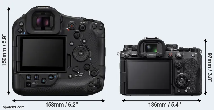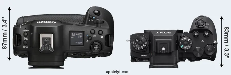 The side-by-side display below illustrates the physical size and weight of the Canon R1 and the Sony A9 III. The two cameras are presented according to their relative size. Three consecutive perspectives from the front, the top, and the back are available. All width, height and depth measures are rounded to the nearest millimeter.