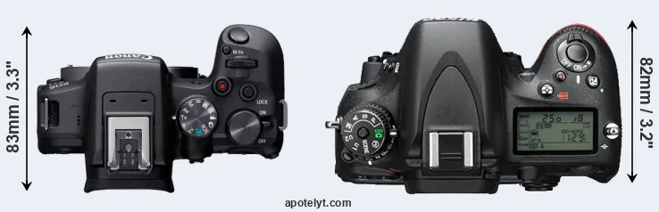 The side-by-side display below illustrates the physical size and weight of the Canon R10 and the Nikon D610. The two cameras are presented according to their relative size. Three consecutive perspectives from the front, the top, and the back are available. All width, height and depth measures are rounded to the nearest millimeter.