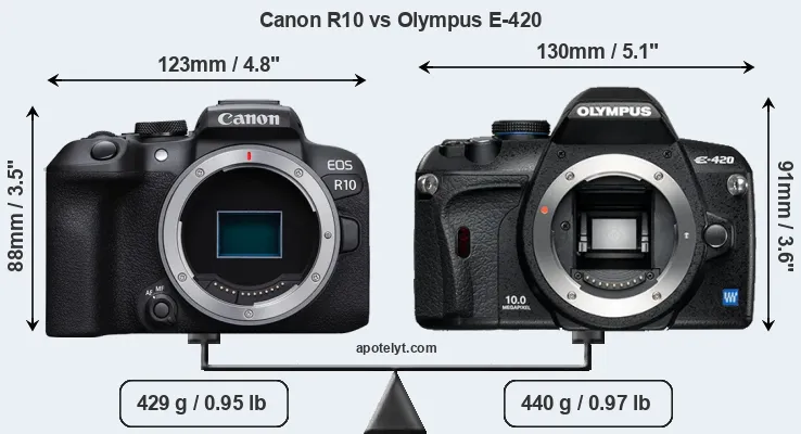The physical size and weight of the Canon R10 and the Olympus E-420 are illustrated in the side-by-side display below. The two cameras are presented according to their relative size. Three successive views from the front, the top, and the rear are shown. All size dimensions are rounded to the nearest millimeter.